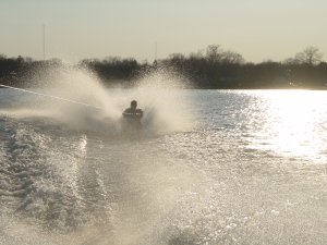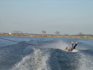 Now Teri is notorious for talking the talk about going skiing in cold weather and cold water, but on a night like tonight, with the wind thrown in, I thought she might wuss out. But she went. She takes a few runs, trying some tumbles and then calls it a night. She even commented that the water wasn’t that cold. I then take one more run until I to finally fall when we get to the rough water. Tired, and now cold, we call it a night.
