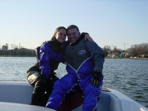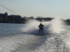 After cruising for a couple minutes to let the engine run up to temperature, we headed to the bay looking for calmer water (this requires a slow idle through a no wake zone). We then cruise around the bay, checking to see where all the crew teams were and where the UW-Ski Team was. We stop and chat with them a bit and then head back to the bridge to set up for the first run. All the while in the bay, I had noticed the boat was taking off just a bit sluggishly.