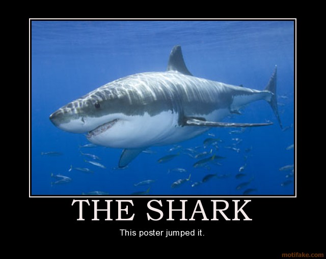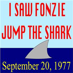 Hopefully, you all know what that phrase means and where it comes from. If not, you’ve been hiding under a rock since 1977 when the phrase began to take form. For those that still don’t know what I’m talking about, I’m referring to the Happy Days episode when Fonzy jumped the shark on a pair of skis. It is widely regarding as the episode when the show started it’s decline (however, it stayed on the air for 6 more seasons). Now, when a show is said to have jumped the shark, it’s on it’s decline.