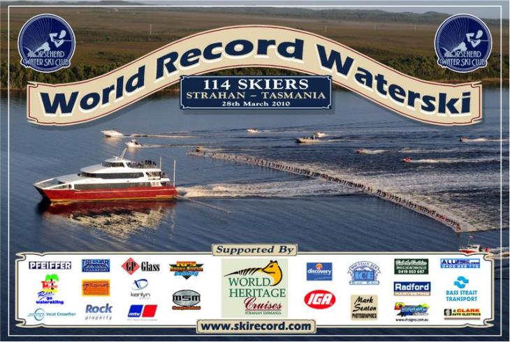 There’s a new world record (recognized by Guinness World Records) in water skiing… The most water skiers towed behind a single boat is 114 by the Horsehead Water Ski Club (Australia) in Strahan, Tasmania, Australia, on March 28, 2010.